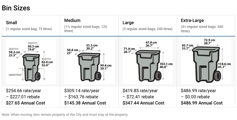 Toronto funds garbage collection through a mixed model. First, there are user fees set based on how much it costs the city to process garbage, based on the size of the bin a household chooses to use: small, medium, large or extra large. Then there are rebates funded through the property tax base, given to all households (except those opting for the extra large bin) that bring down the costs.