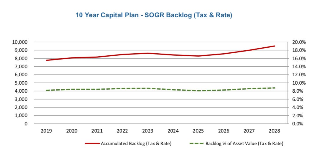 Here’s the City’s State-of-Good-Repair (SOGR) backlog for the next decade. SOGR is the measure of how much the city would need to spend to fix up infrastructure.