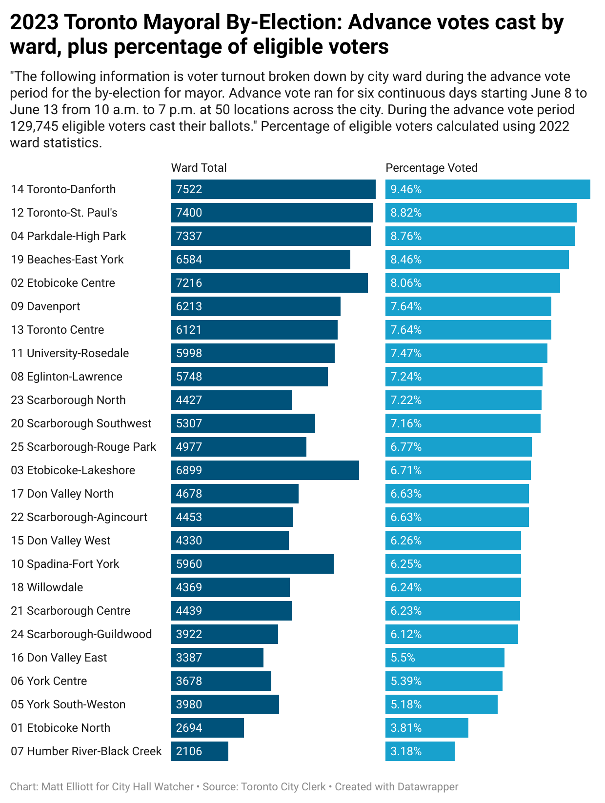 The City has provided a ward-by-ward breakdown of the 129,745 votes cast in the early vote window between June 8 and June 13. I, of course, made a chart.