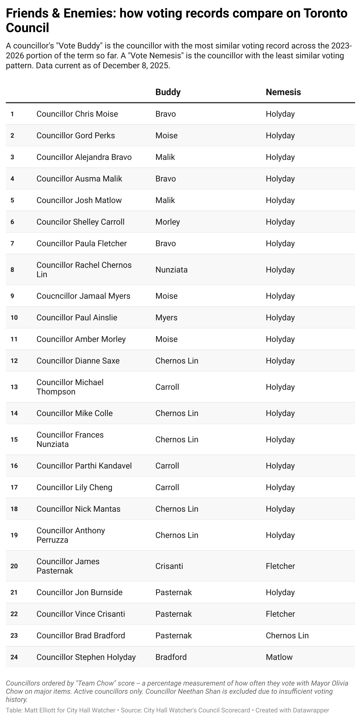 ew-and-improved Council Scorecard. I’ve fed a bunch of data into the machine and produced a visual look at how councillors vote together on major issues. Also, on a lark, I’ve assigned each councillor a VOTE BUDDY and a VOTE NEMESIS. We’ll have fun.