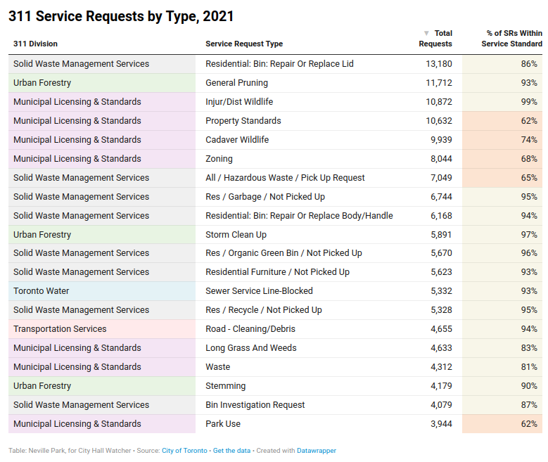 I had a little fun with this report on 311 service requests, as it’s a little more pared-down than the Open Data downloads. They only created a table, so I made an interactive version. Please check it out, because I’ve wasted so much time on this.